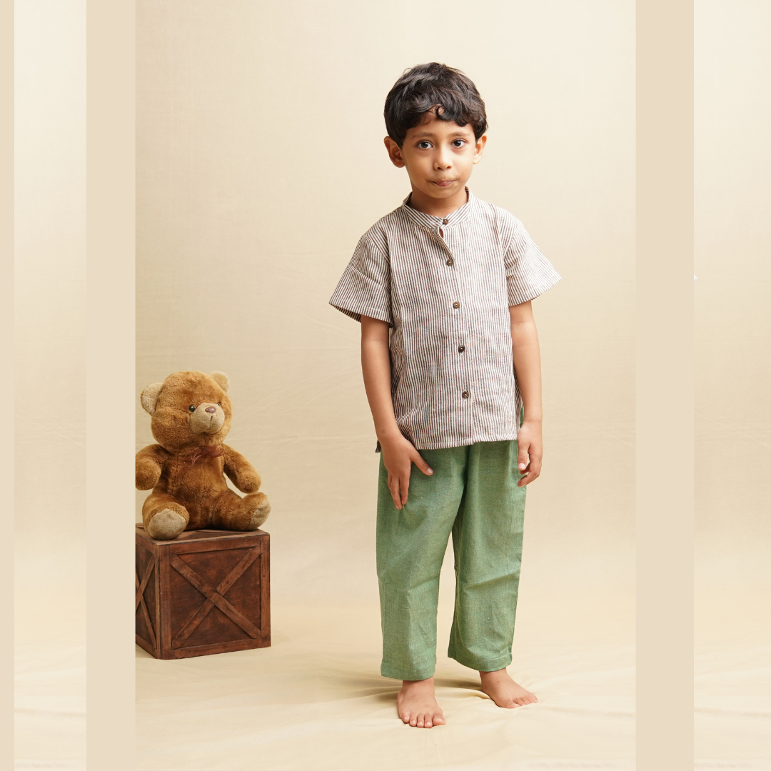 Introducing Nature Wear Cotton Pants - Unisex Trousers in Khadi. Keep your little one comfortable with this elegant summer unisex outfit – a timeless bottomwear crafted from breathable khadi cotton. Designed with care and simplicity, this ensemble brings together natural materials and a polished silhouette, making it ideal for both playtime and special occasions.